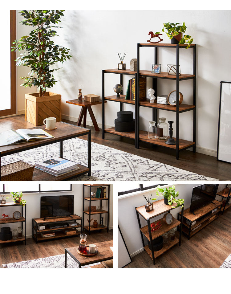 黒いフレームとヴィンテージ調棚板が印象的なブルックリン調の4段シェルフ。