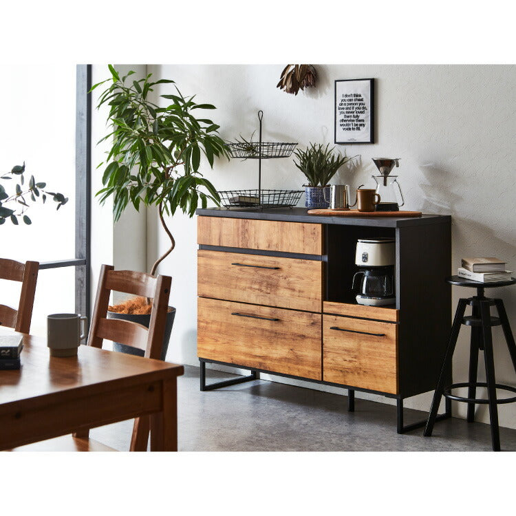 ヴィンテージ調の木目調とブラックの組み合わせがおしゃれな食器棚。