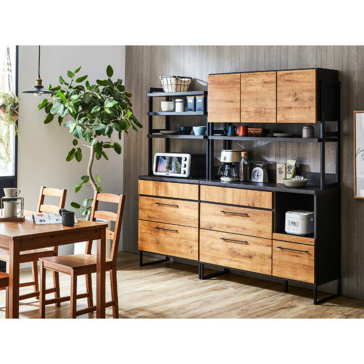 ヴィンテージ調の木目調とブラックの組み合わせがおしゃれな食器棚。