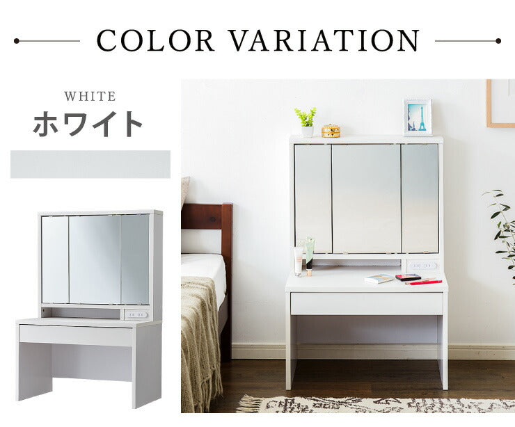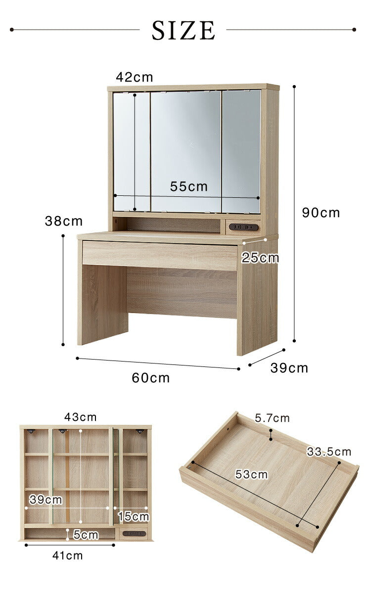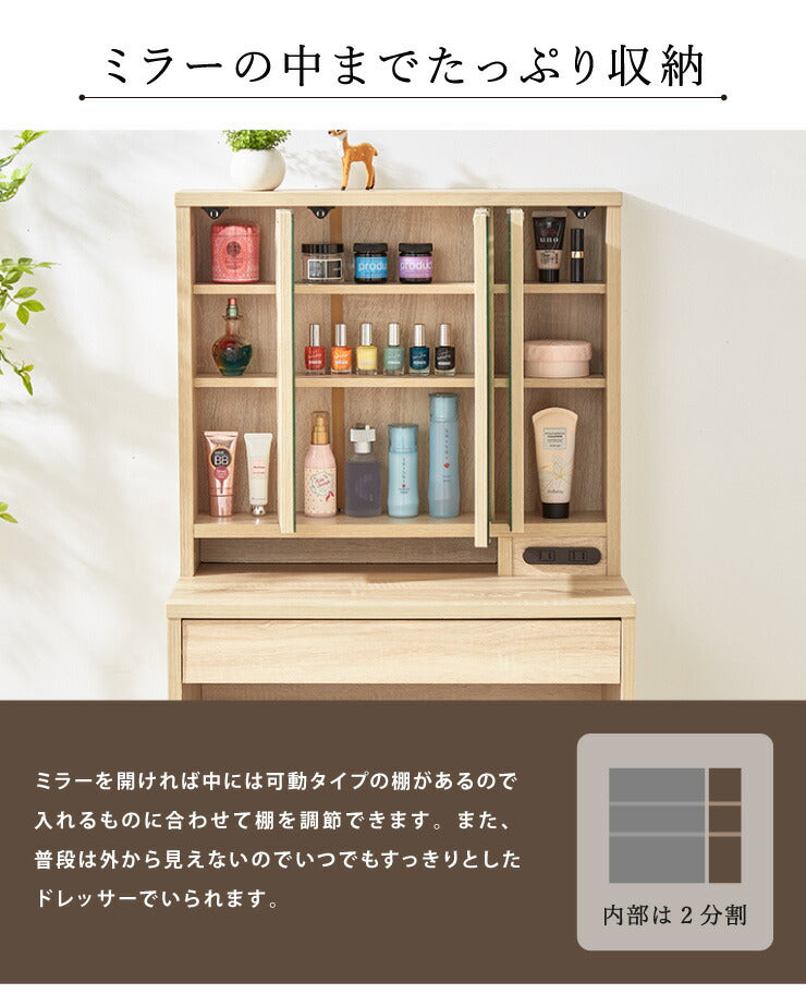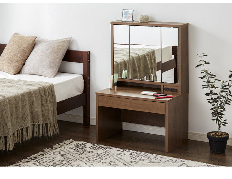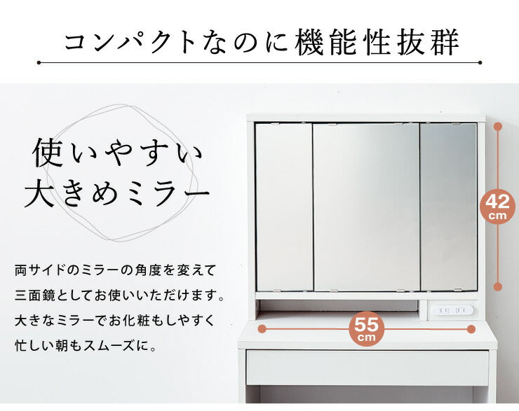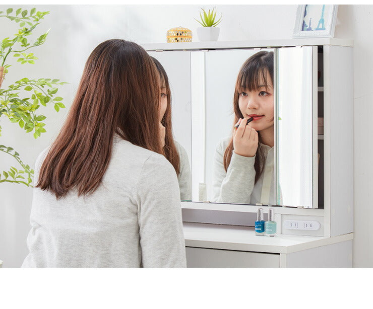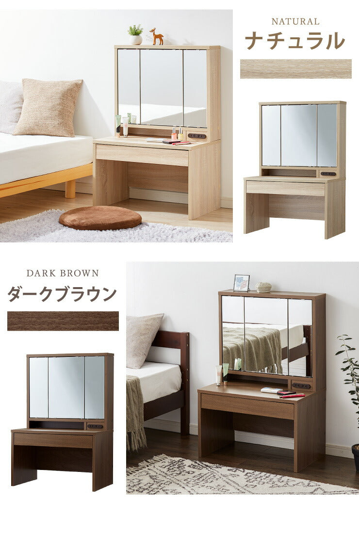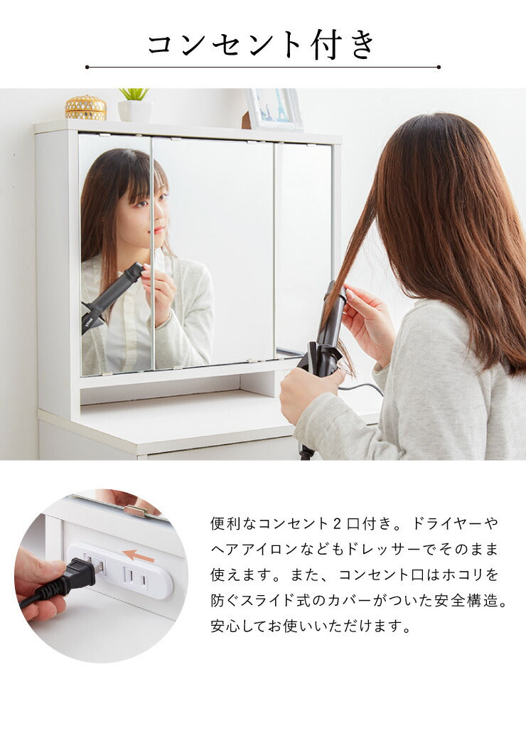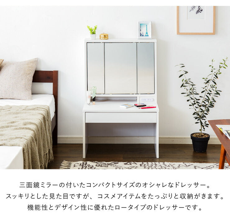 ドレッサー デスク ロータイプ 三面鏡 収納 引き出し 2口 コンセント 幅60 高さ90 ミラー 3面鏡 鏡台 メイク台 化粧台 おしゃれ