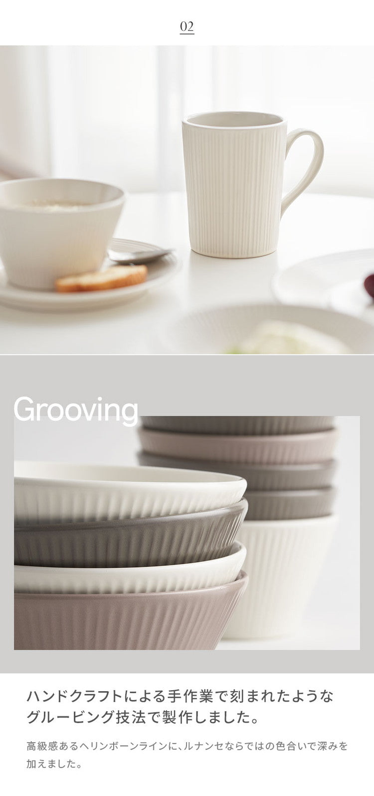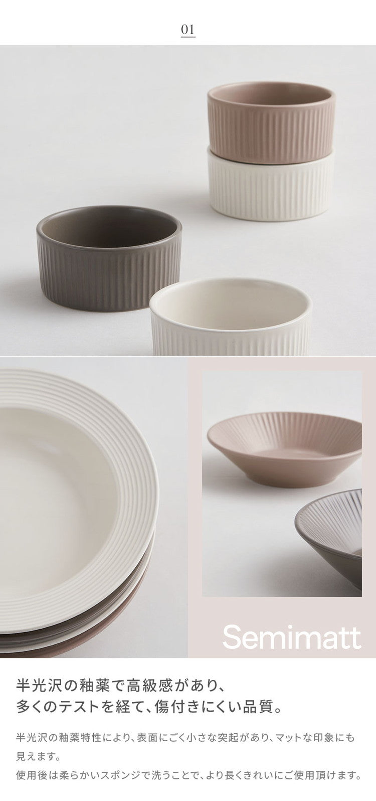 半ツヤ消し釉薬を使用してスクラッチに強く、高級感が感じられます。モダンな色味の食器で、食卓の感覚的な演出ができます。