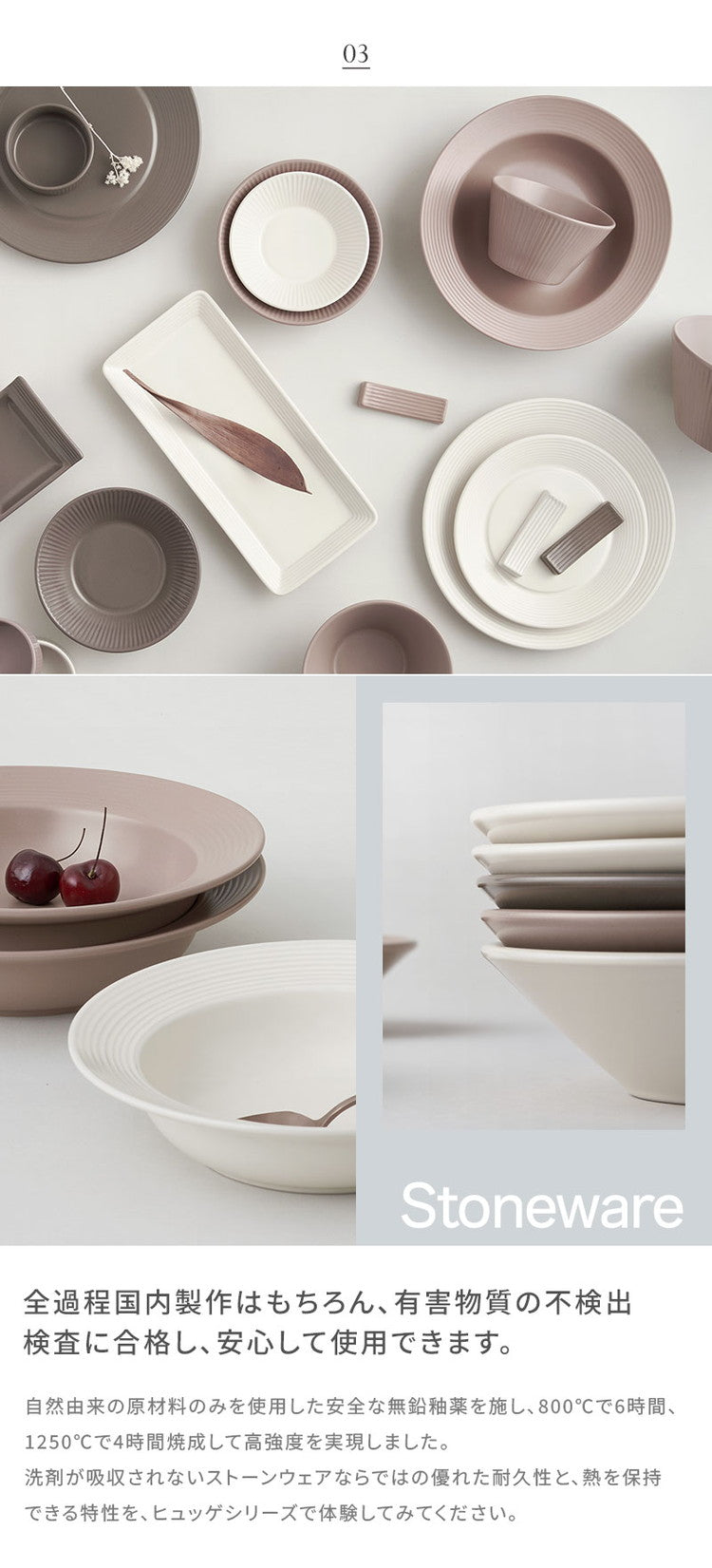 熟練職人の手作業で完成度を高めた食器セットは人体に無害な釉薬とストーンウェアを使用し、安心してお使いいただけます。
