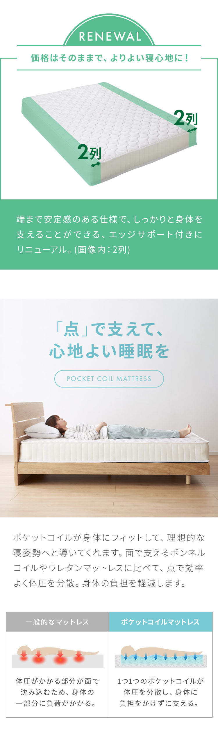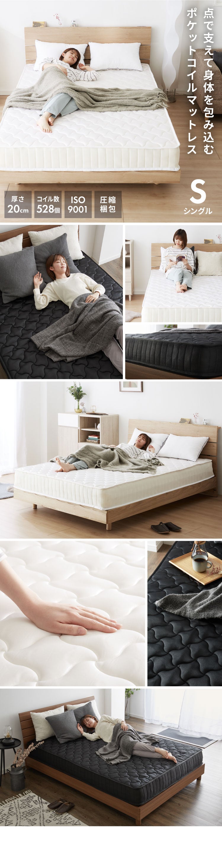 寝具、マットレス、ポケット、コイル、ポケットコイル、ポケットコイルマットレス、ロールマットレス、熱処理、ホワイト、白、ブラック、黒、圧縮、梱包、ロール、梱包、コンパクト、通気性、キルティング、体圧分散、新生活、エコテックス認証、極厚、コイル数、429個、528個、660個、759個、891個、990個