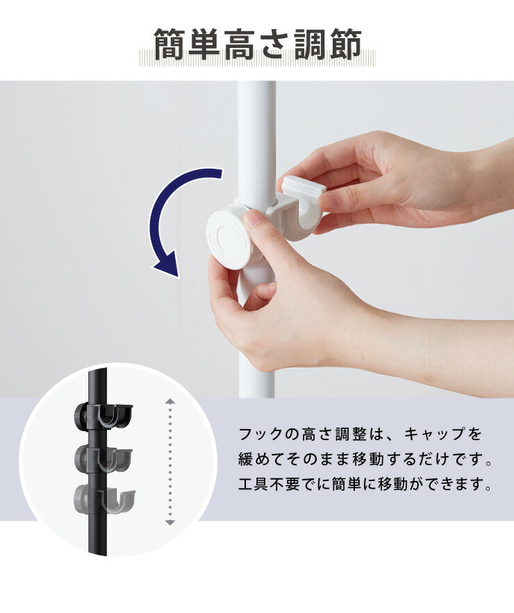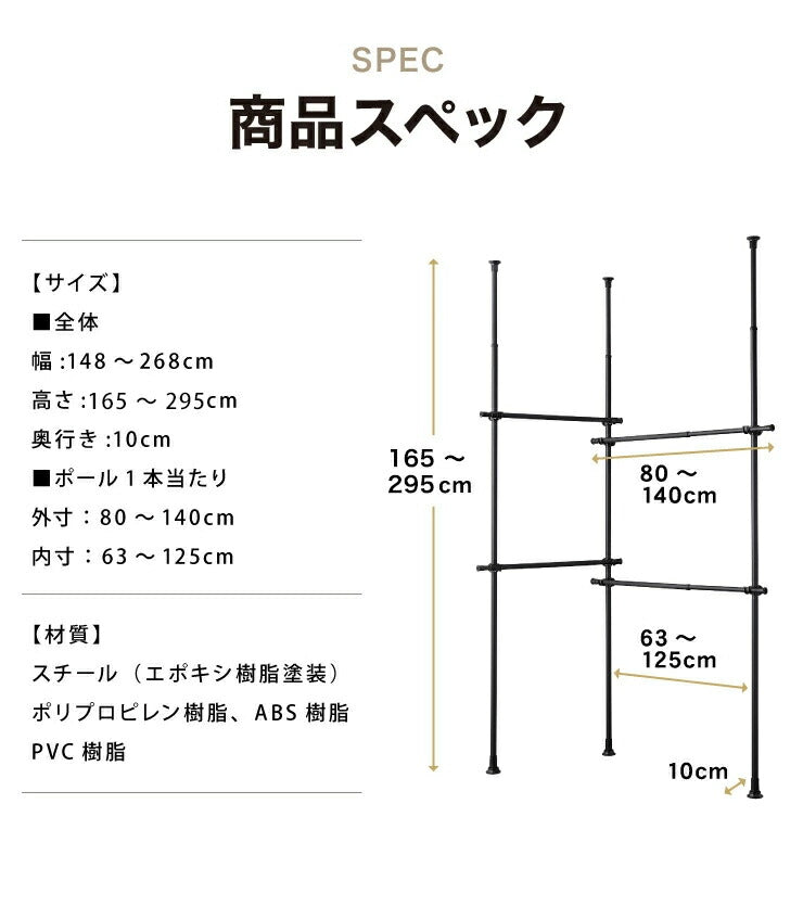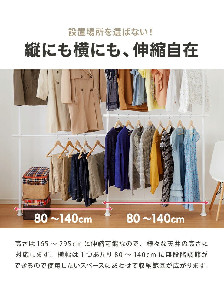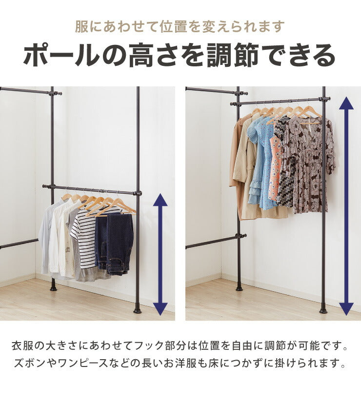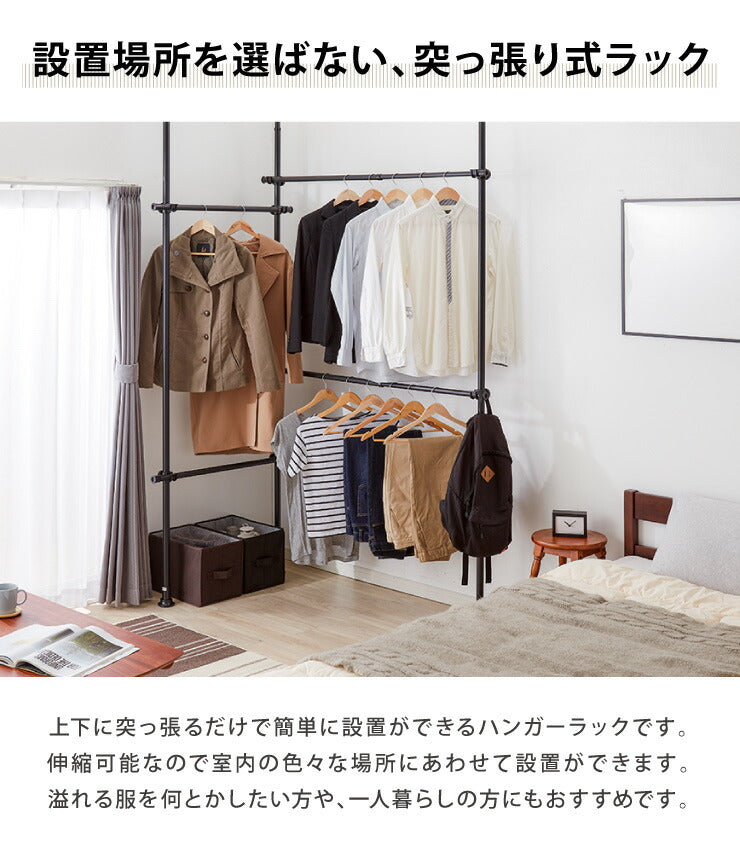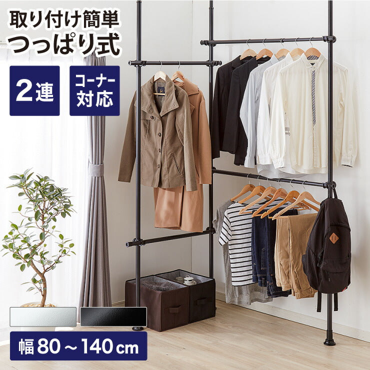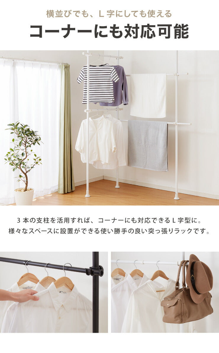 突っ張り ハンガーラック 4段 2連 L字可能 幅80~140cm 北欧 おしゃれ 頑丈 引っ掛け棒付き 天井突っ張り式 つっぱり収納 省スペース クローゼット 突っ張りラック 突っ張りハンガーラック ウォークイン
