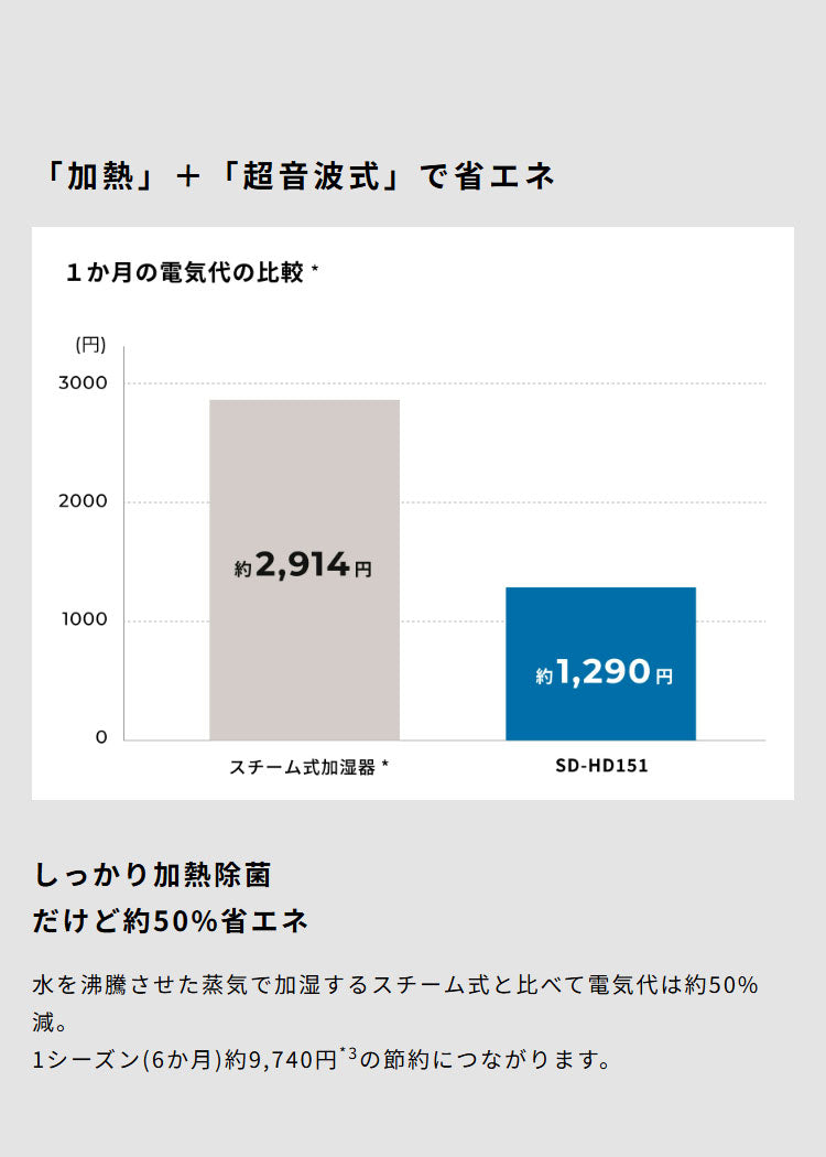 ・ 省エネで、最大500ml/hのパワフル加湿。水を沸騰させた蒸気で加湿するスチーム式と比べて電気代は約50%減で、1シーズン(6か月)約9,990円の節約につながります。