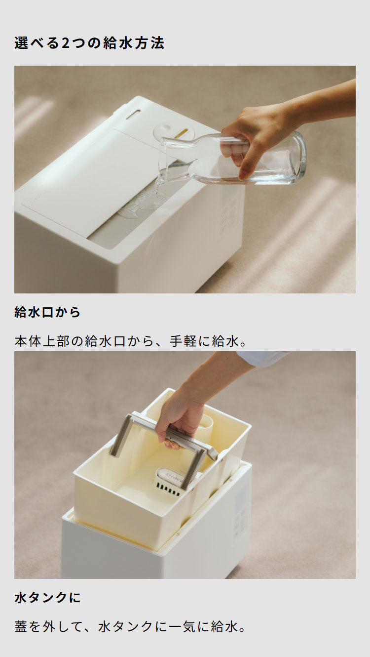 ・ 水タンクは5Lの大容量。500ml/hの最大加湿量で運転時、最長10時間給水不要で連続加湿が可能です。水は上からそのまま注げる上部給水式で、重いタンクを持ち運ぶことなくラクに給水できます。