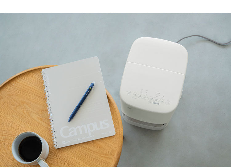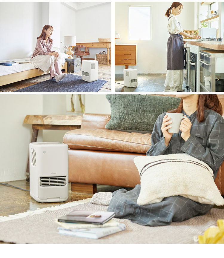・A4 よりも小さいコンパクトサイズなのに、あたためも加湿もこれ一台。セラミックファンヒーターと気化式加湿器がひとつになった、あたためも加湿もできる製品。あたためながら加湿して乾燥を防ぐことはもちろん、湿度センサー付きの「湿度リモコン」で湿度のコントロールもできるため、シーンに合わせて快適な空間作りをサポートします。