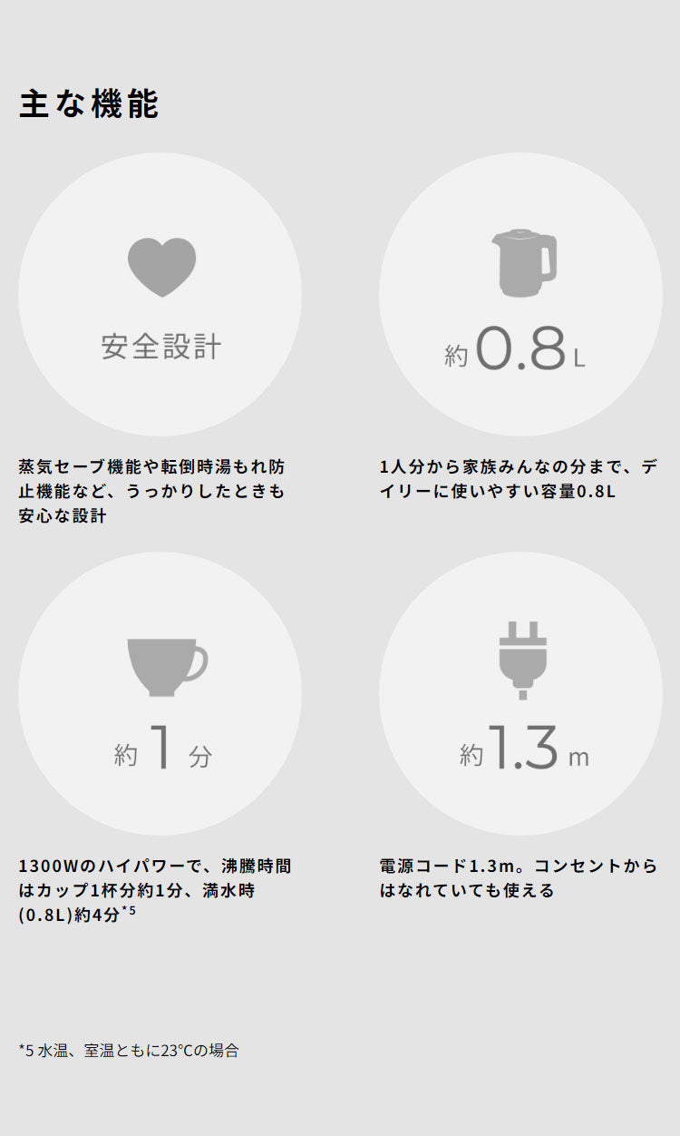 1300Wのハイパワーで、コップ一杯分(140ml)は約1分で沸騰。欲しいときに欲しい分だけ、すぐにお湯を沸かすことができます。さらに、注ぎ口を細くすることで水流を整え、注ぎやすさにもこだわっています。