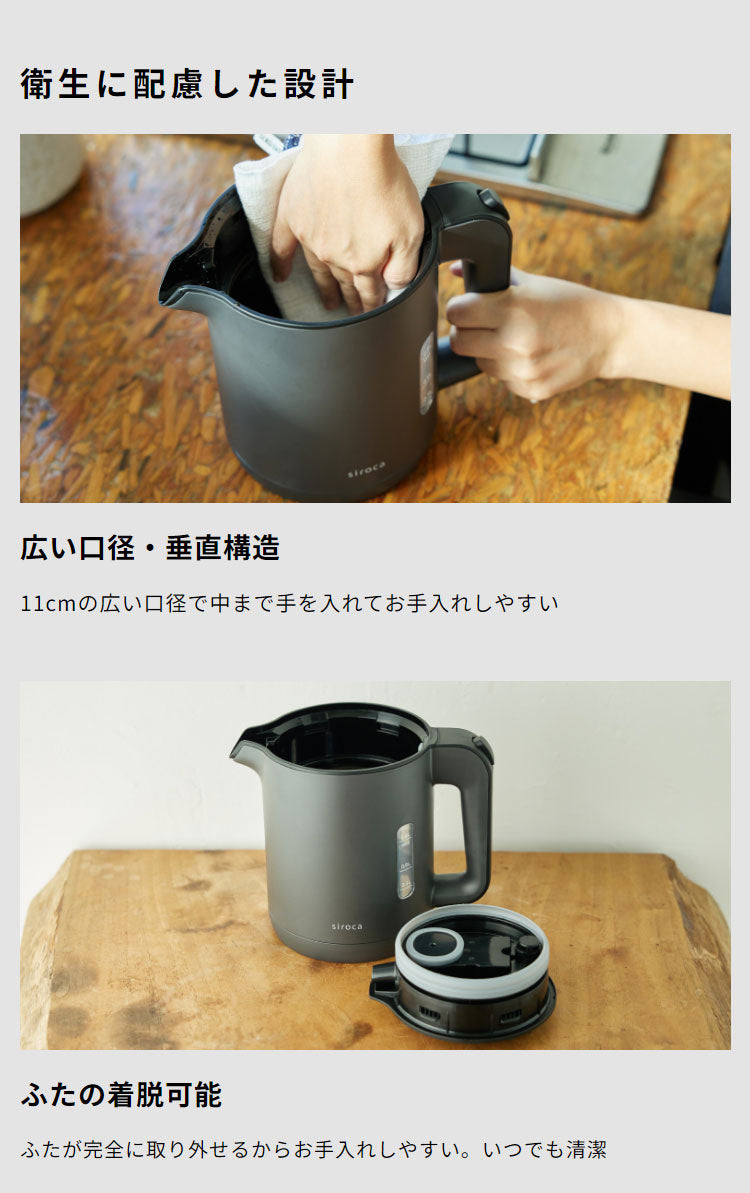 ふたは完全に取り外すことができるため、お手入れ簡単。ケトル本体も、直径11cmの広い口径で中まで手を入れて洗いやすく、いつでも清潔にお使いいただけます。