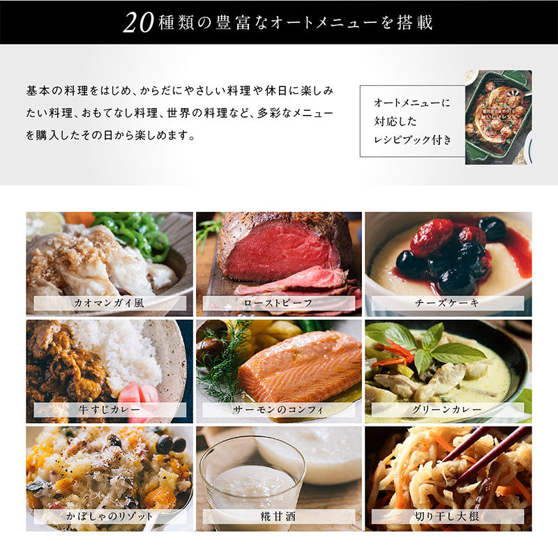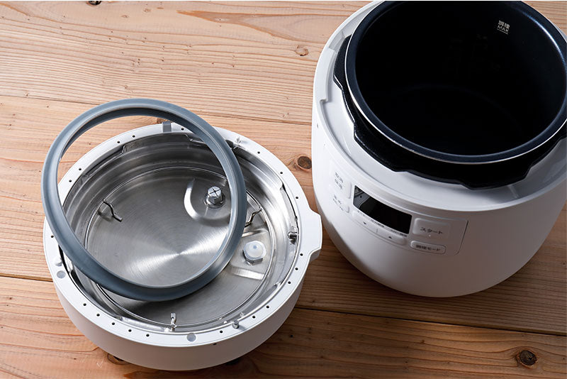付属品: 計量カップ、レシピブック、蒸し台、パッキン(ふた用・予備)