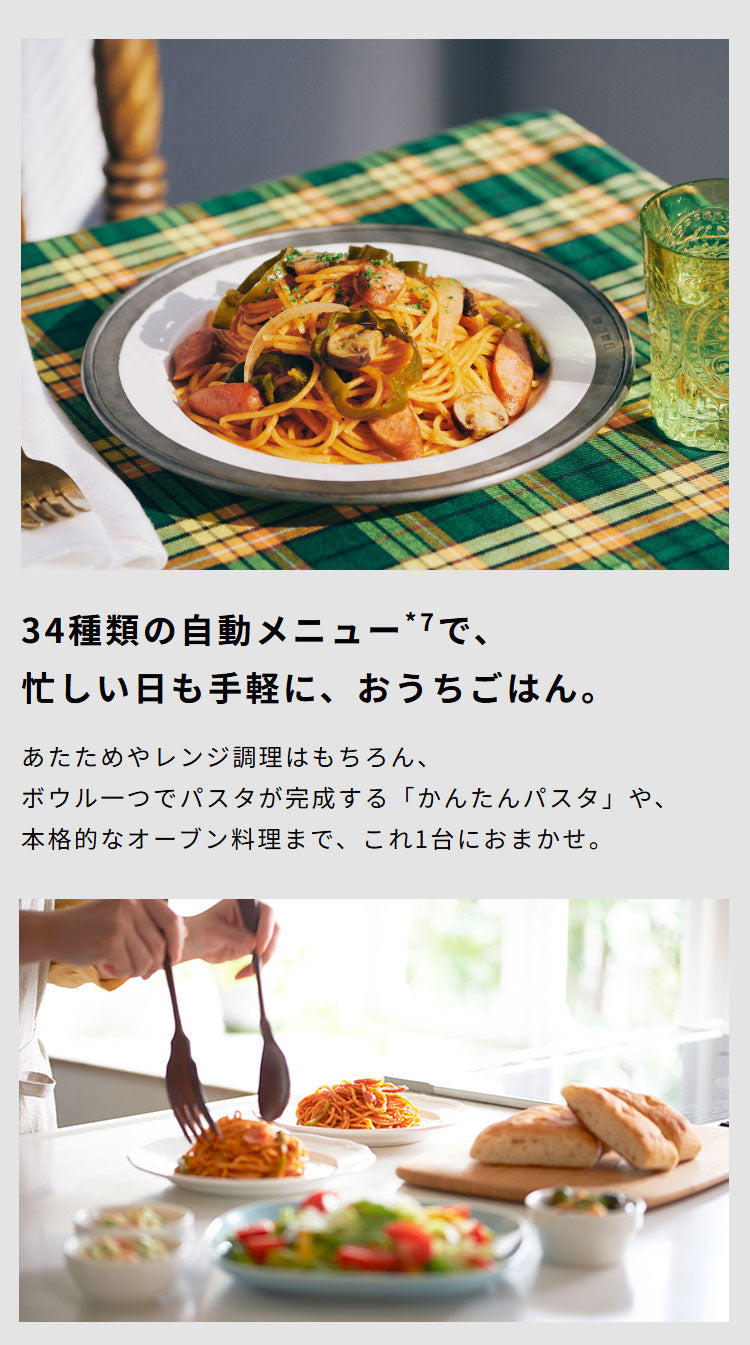 5.あたためもオーブン調理もこれ1台。34種類の便利な自動メニュー