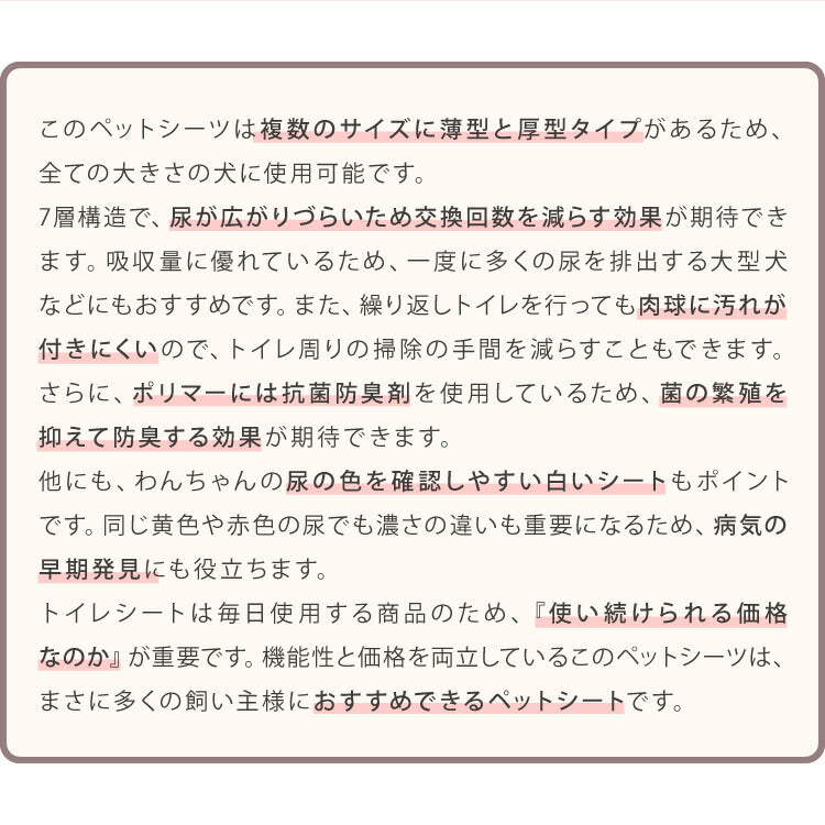 犬用、業務用、使い捨て、まとめ買い、猫、ウサギ、モルモット、多頭飼い、いぬ、イヌ、ねこ、ネコ、介護用、子育て、高吸収、清潔、コンパクト、監修、健康管理、小型犬、中型犬、大型犬、脱臭、汚れ防止、全面接着、高吸収ポリマー、7層構造、3サイズ、犬猫用、おしっこシーツ、マーキング防止、トイレ、ペットトイレ、漏れない、薄手、介護、老人、シーツ、老人ホーム、高齢者施設