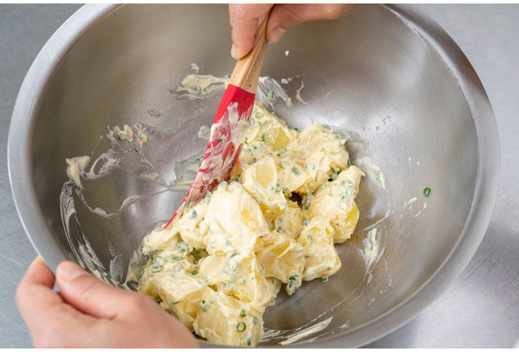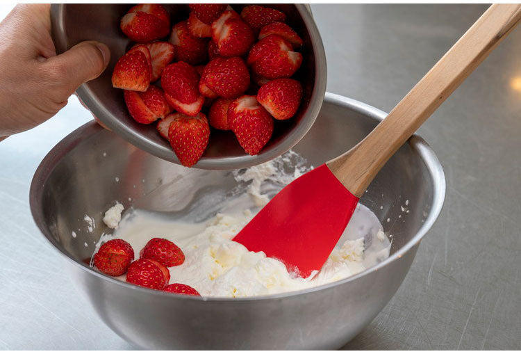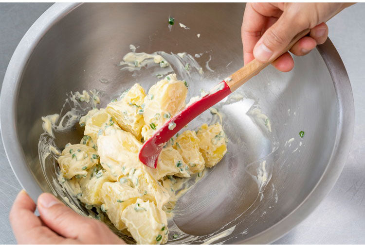こだわりのカタチも硬さも全てがお料理をキレイに混ぜあわせたり、キレイに取るため。「これが硬すぎたりとかカタチがおかしかったりすると取れない。途中であきらめて、洗ってしまうともったいないんです。もう本当にキレイに取れるということがすごく大事なんです。」と語る有元さん。ちょうどいい硬さをもとめて完成したこのシリコーンヘラを「気持ちよくお料理したい人に是非」使っていただきたいと考えています。