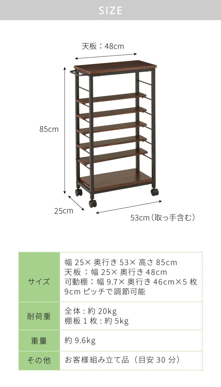キッチンワゴン 幅25cm 棚位置自在 キャスター付き 高さ85cm 隙間収納 モダン 北欧 おしゃれ ダイニング キッチン リビング 新生活 整理 収納 収納ワゴン マルチワゴン おもちゃ箱