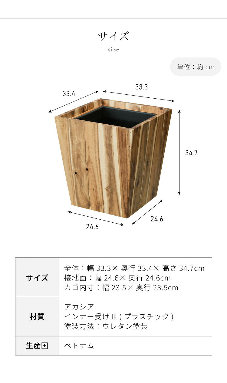 アカシアプランターボックス 7号鉢用 プランターカバー ウッドプランターボックス ウッドプランターカバー スクエア型 インナーポット付き 底穴なし 33.3cm×33.4cm×34.7cm 木製 鉢カバー(代引不可)