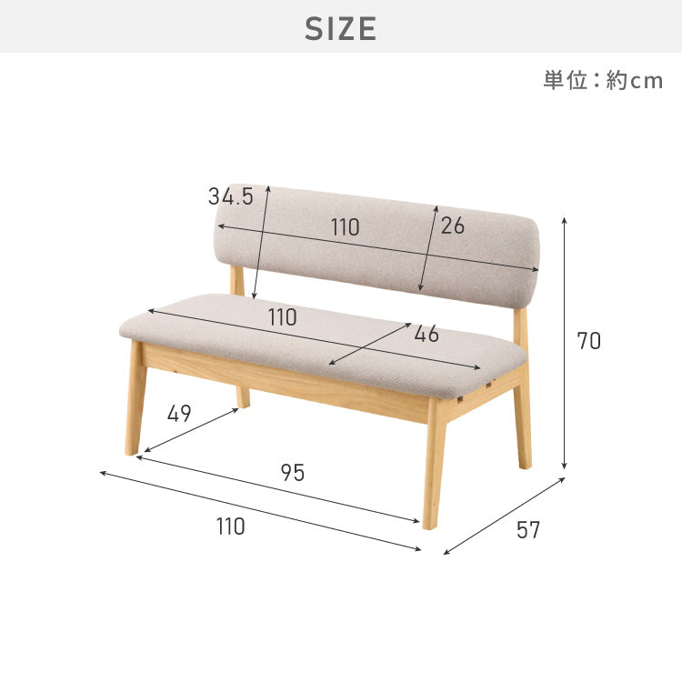 座面高39cm ゆったりダイニングベンチ 幅110 ベンチ ロータイプ 天然木 ファブリック ダイニング ベンチ 背もたれ 2人掛けベンチ 椅子 ダイニングチェア 食卓椅子 食卓チェア ナチュラル【送