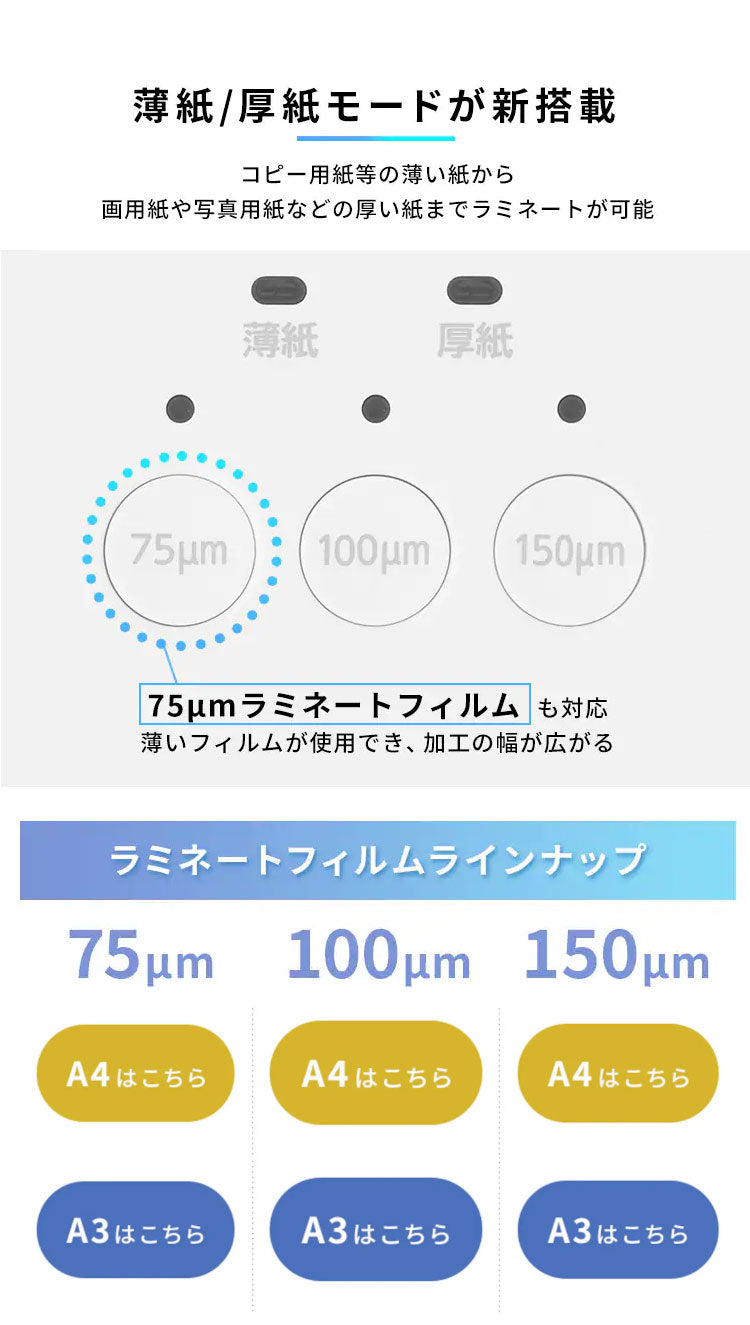 コピー用紙等の薄い紙はもちろん、画用紙や写真用紙等の厚い紙でもラミネートが可能に!