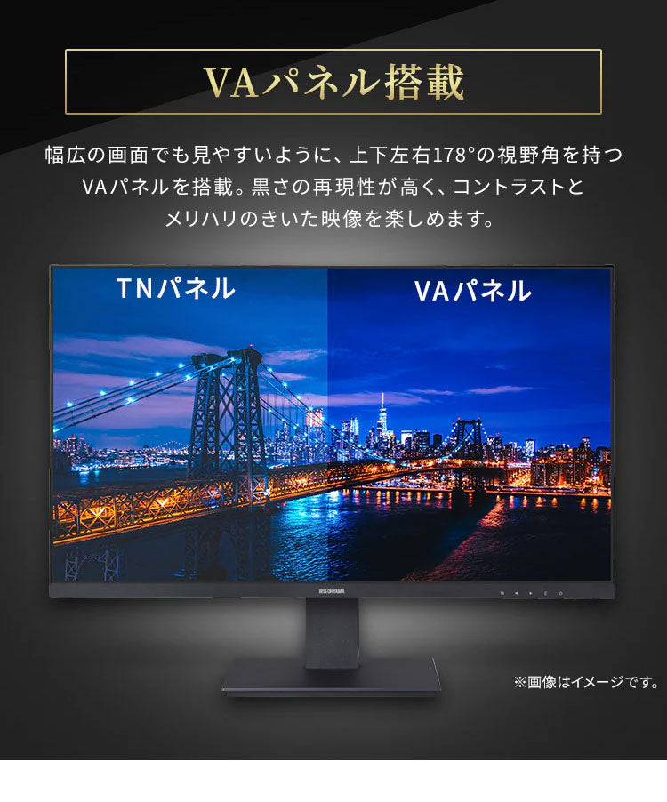 幅広の画面でも見やすいように、上下左右178°の視野角を持つVAパネルを搭載。