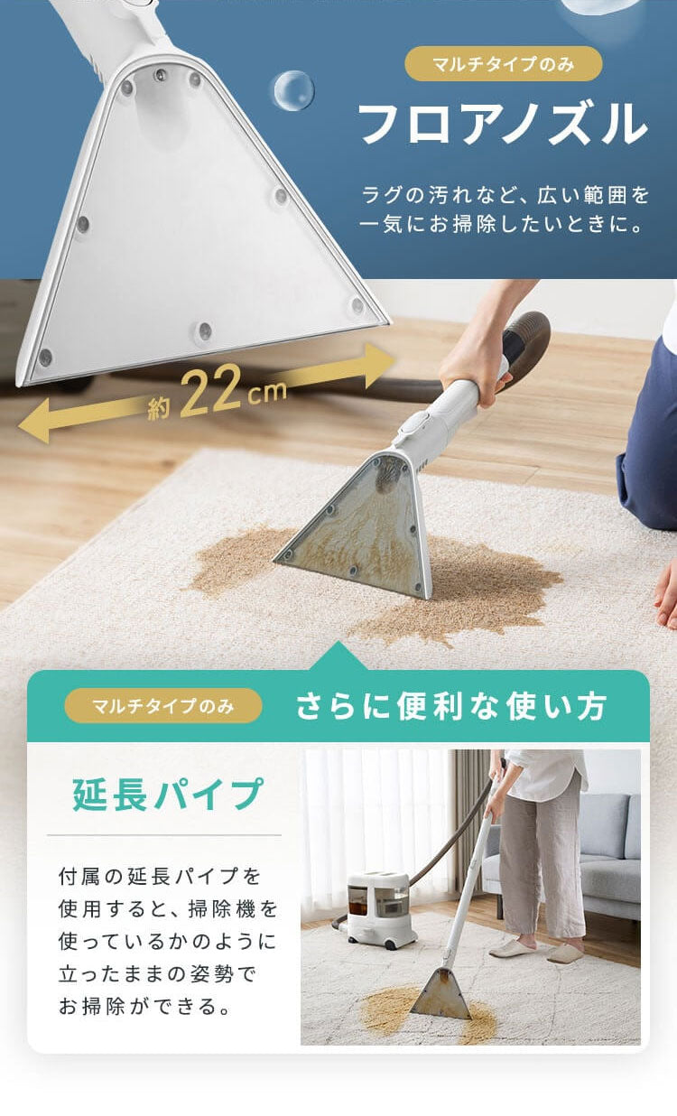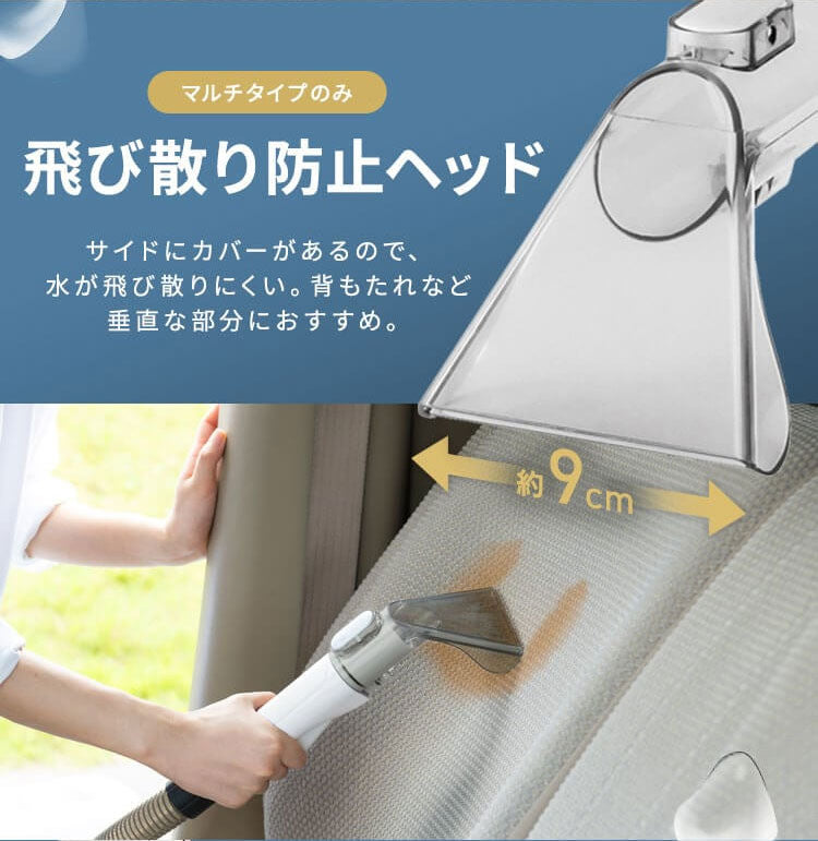 3種類のアタッチメント(飛び散り防止ヘッド、ブラシ付きヘッド、フロアノズル)でお掃除がスムーズにできます。