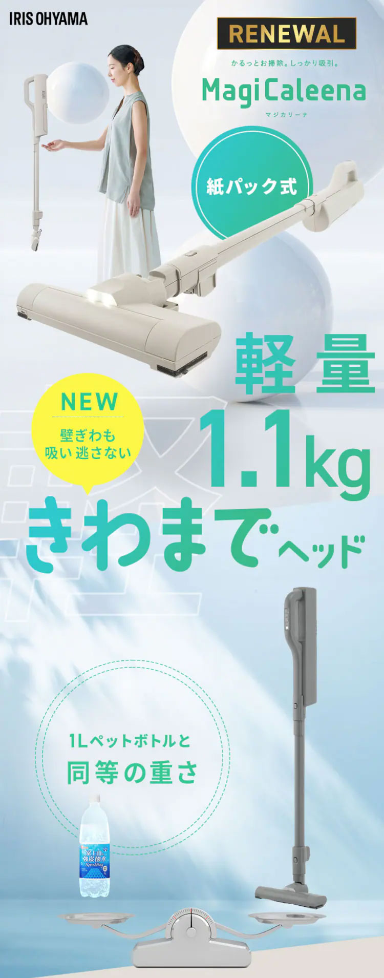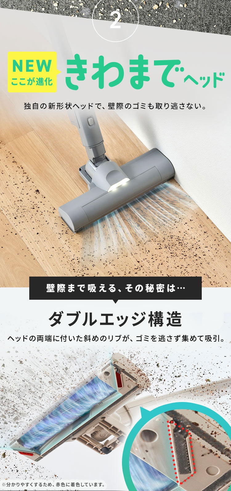 アイリスオーヤマ独自の新形状[きわまでヘッド]で、よりゴミを吸い逃しにくい構造です。