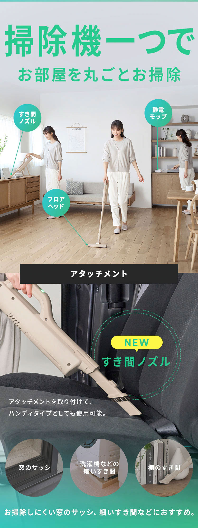 付属アタッチメントを活用することで、床、棚のすき間、車の中など、家中どこでもお掃除ができます。