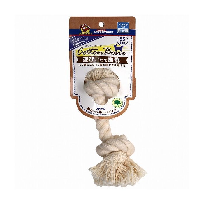 ●太さのあるハードなコットンロープ両端をしっかり結んだ骨型のおもちゃ。●しっかり編んだコットンロープは噛むことで歯の汚れをかき出しながら、歯ぐきをマッサージするデンタルケア玩具。●噛んだり、くわえてたり、ハードなロープで色々遊んであごのトレーニングやストレス発散にも役立つ。●水洗いでき、永く、清潔に使える。超小型、小型犬用。長さ約11cm。
