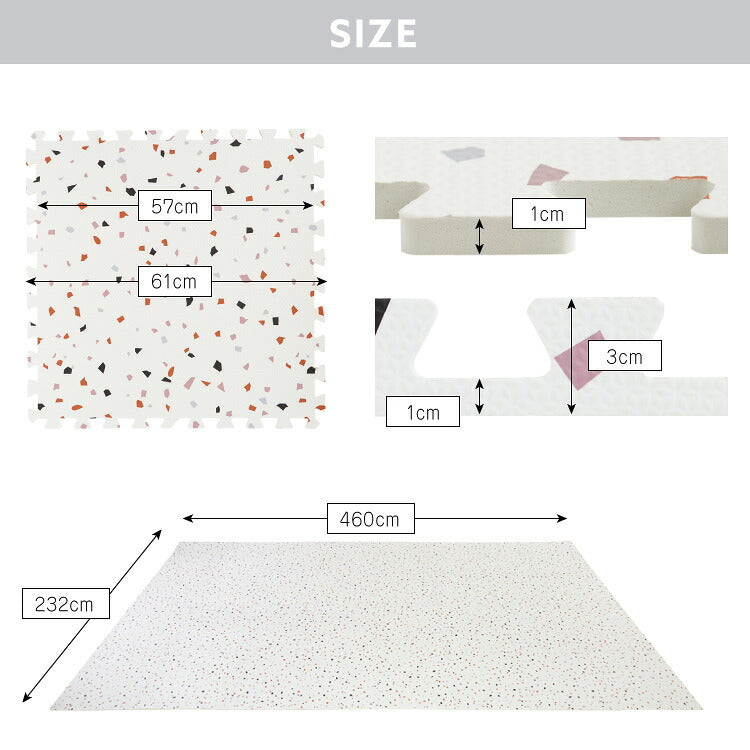 ジョイントマット、大判、61cm、32枚、テラゾー柄、PE樹脂、低ホルムアルデヒド、6畳相当、6畳用、32枚組、洗える、防音、断熱、保温、サイドパーツ付、レイアウト自由、カットOK、ごろ寝、安心素材、ベビー、赤ちゃん、幼児、キッズ、キッズ用、ペット、おしゃれ、かわいい、リビング、子供部屋、フロアマット、プレイマット、キッズマット、ベビーマット、パズルマット、カーペット、マット、ラグ、DIY、テラゾー