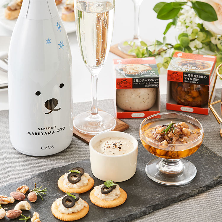 見た目とはうらはらの本格スパークリングワイン、「シロクマ・ブリュット マルヤマ・ズー」とレストランやバルで味わうような本格的なおつまみのシリーズ2種をセットした、乾杯にぴったりのセット。休日の昼下がり、ゆっくり飲み始めるのにぴったりのセットです。