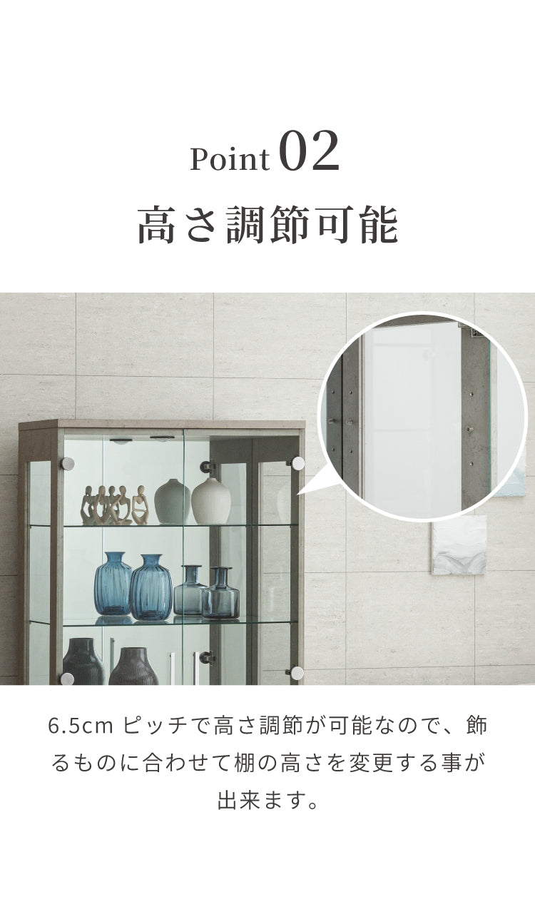 ・ゆとりのサイズ感: 幅80cm、高さ180cmという十分なサイズで、フィギュア、ミニカー、コスメ、食器、トロフィーなど、様々なコレクションを一度に大量に展示できます。