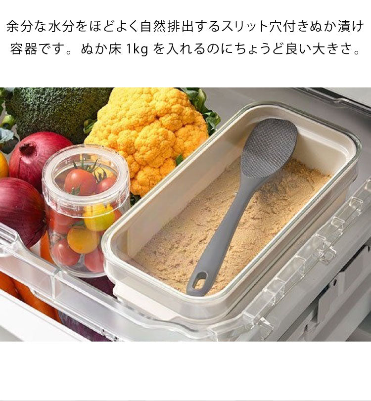 余分な水分をほどよく自然排出するスリット穴付きぬか漬け容器です。