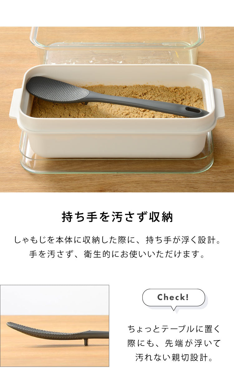 便利な専用しゃもじ付きで、かき混ぜや野菜の取出し、ぬかならし等に便利。Wエンボス加工で、ぬかが付きにくい仕様です。