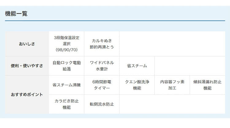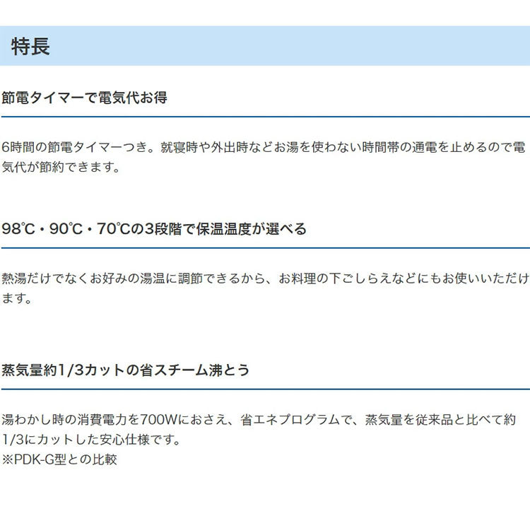 湯わかし時の消費電力を700Wにおさえ、省エネプログラムで、蒸気量を従来品と比べて約1/3にカットした安心仕様です。