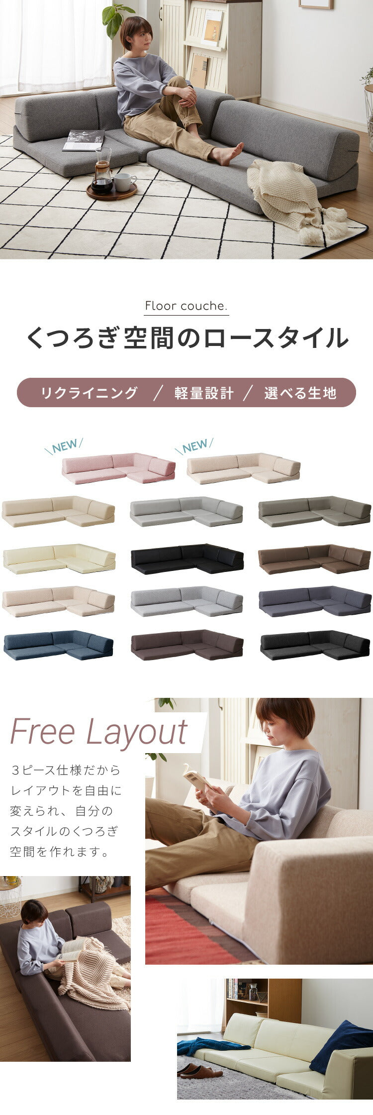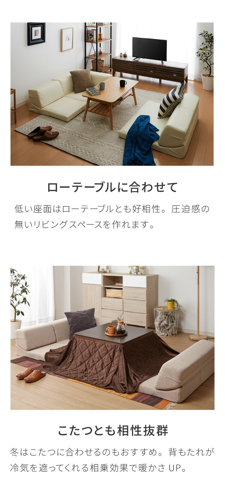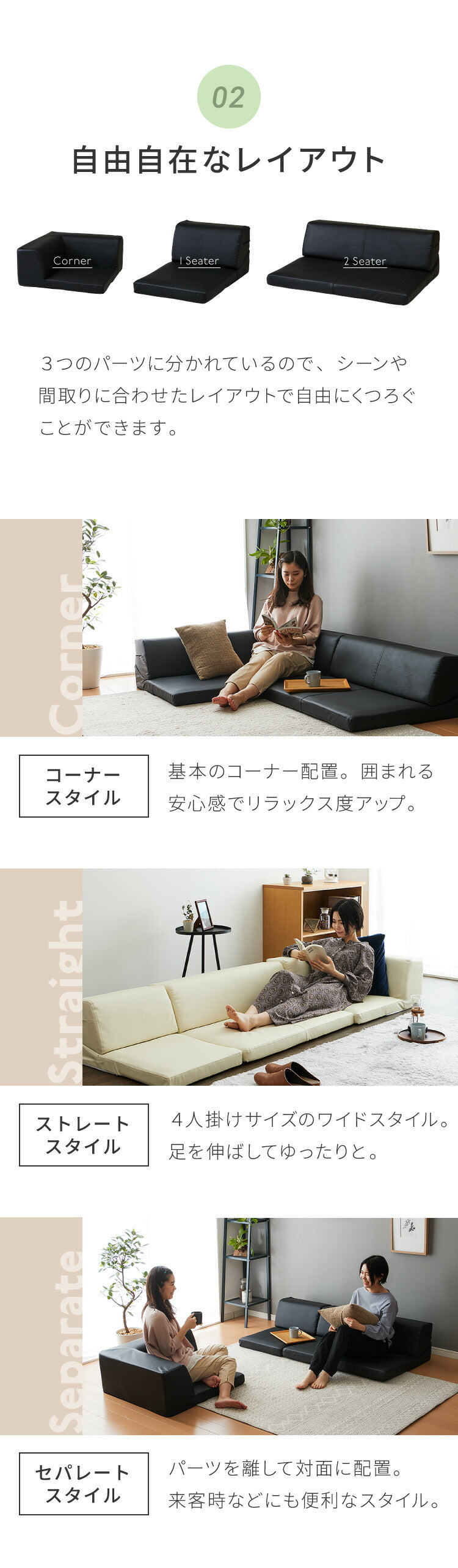 組み合わせ無限大。 来客時も、お昼寝も。変幻自在な3人掛けローソファ。