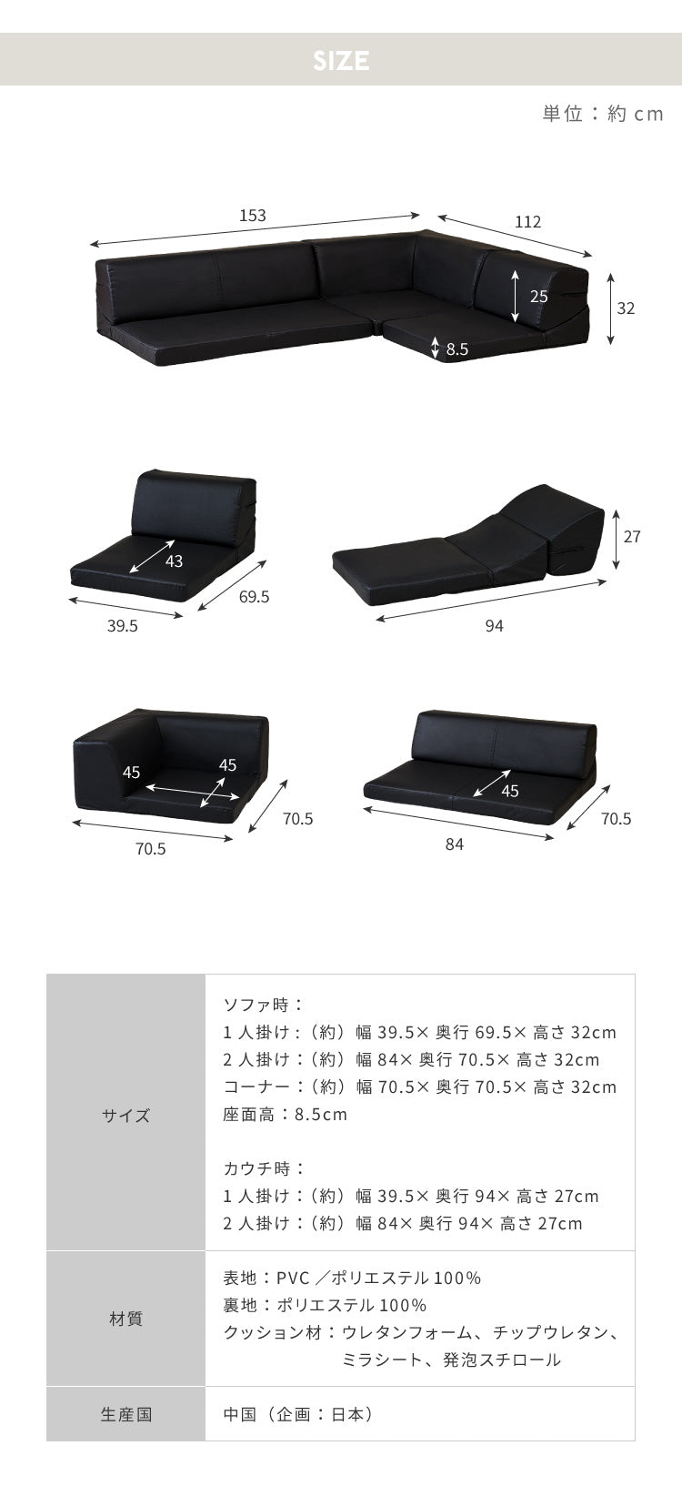 [全体サイズ]幅153×奥行112×高さ32(座面高さ8.5)cm