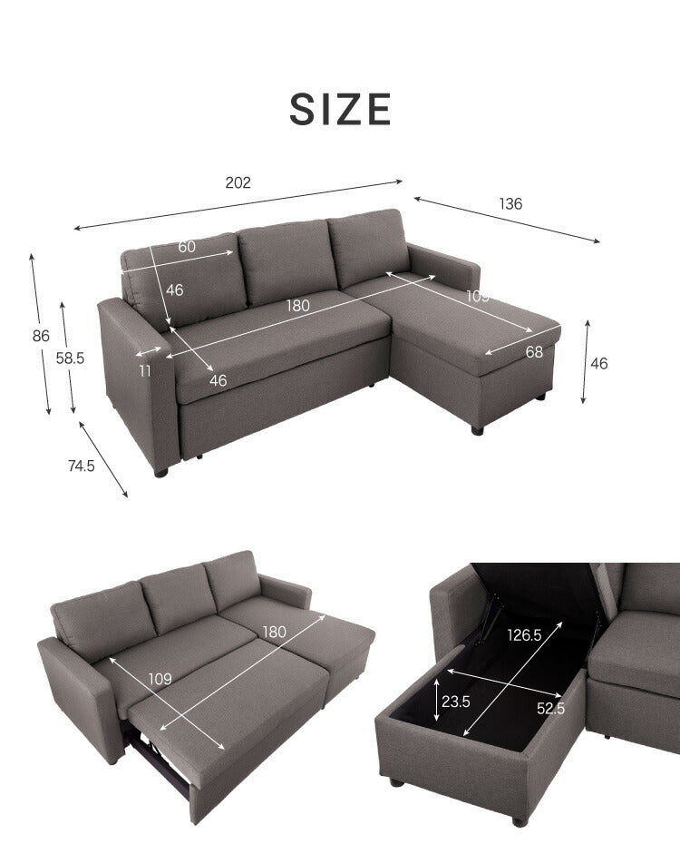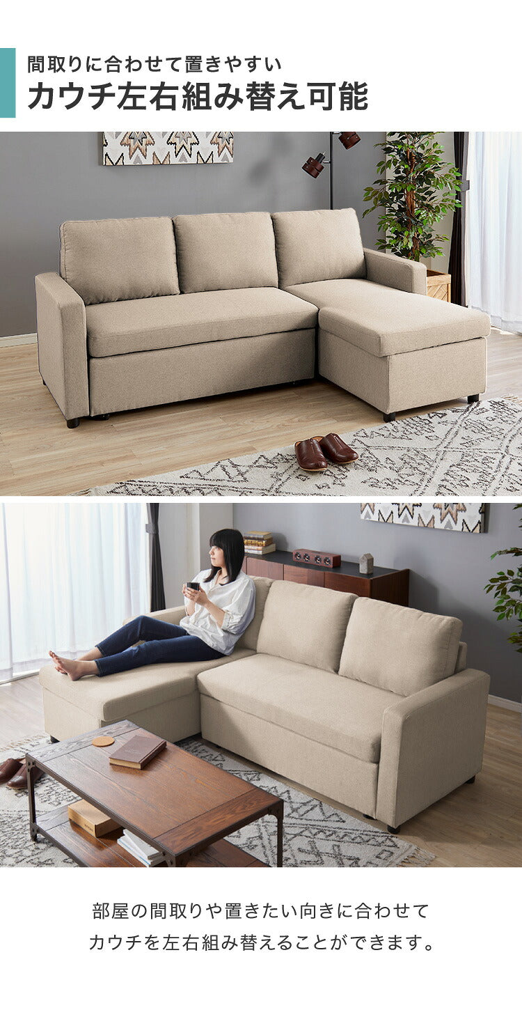 跳ね上げ式 ソファベッド 3人掛け 幅202cm 収納付き L字 3P おしゃれ 北欧 ファブリック カウチソファ コーナーソファ ソファーベッド 収納 お昼寝 カウチ リビング 大きめ ベッド 収納ソファ