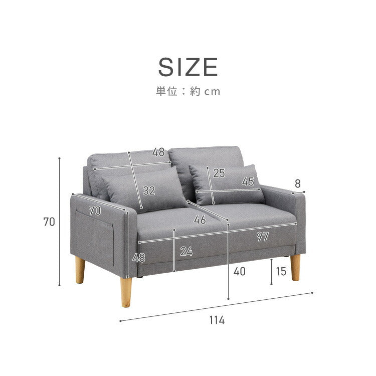 ソファ 2人掛け 幅 114cm 奥行 70cm コンパクト ソファー オットマン 座面 広い 木脚 クッション 肘置き ハイバック 北欧 おしゃれ 小さめ モダン ファブリック ゆったり