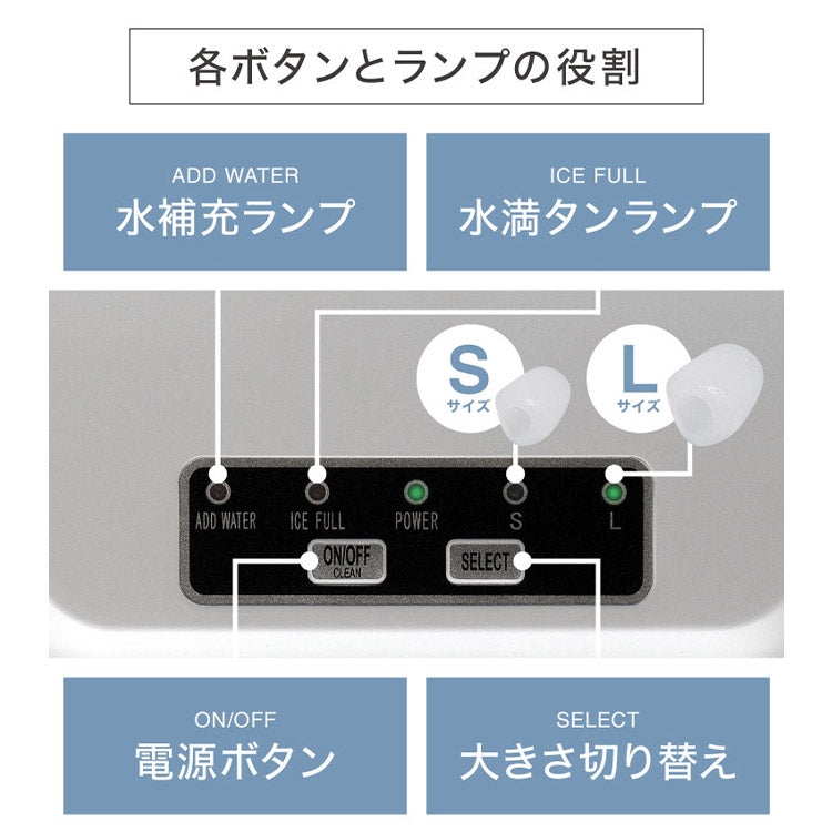 氷が満杯になると自動で停止し、水が不足すると自動で停止する安全機能付き。